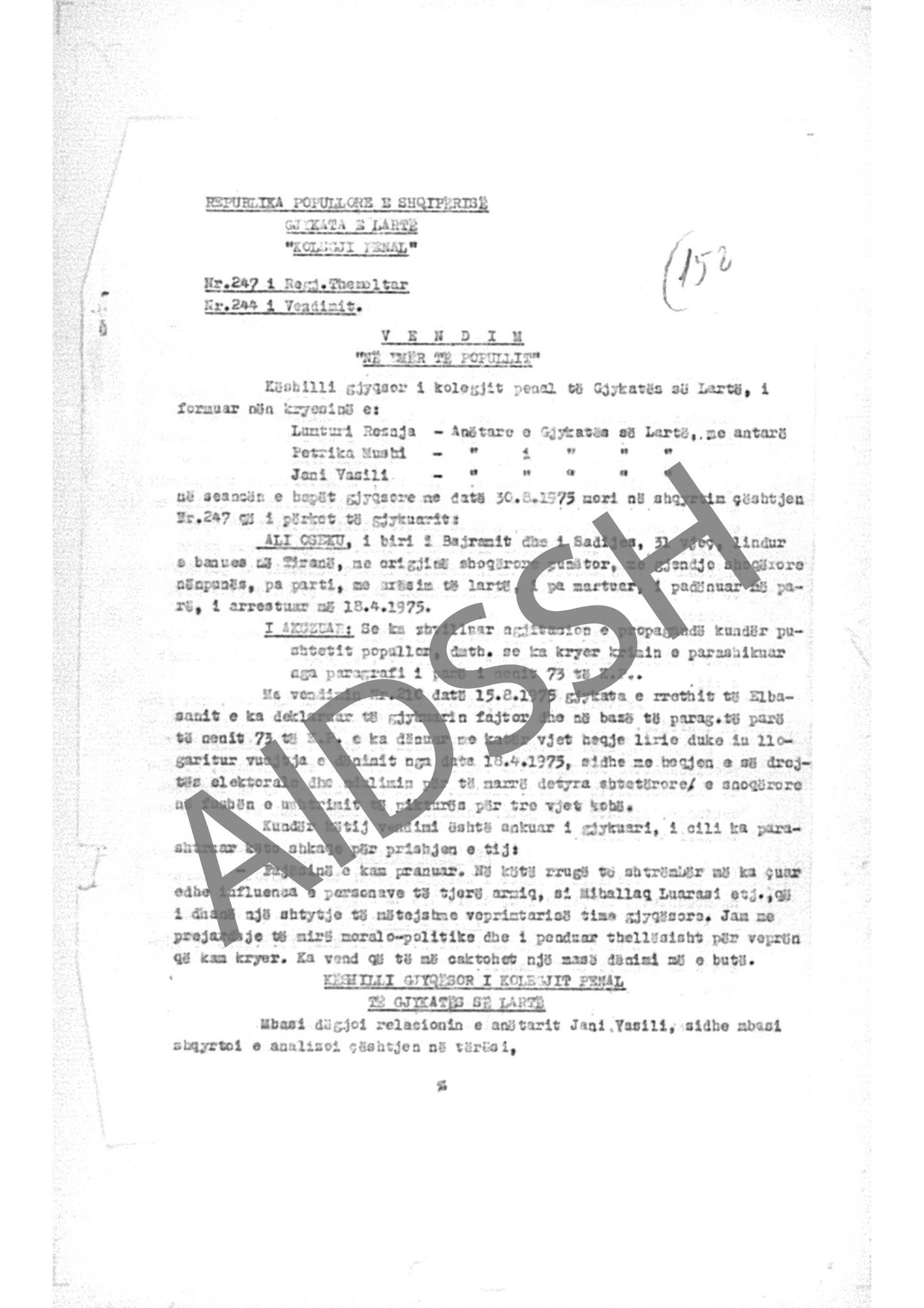 Zhvillimet historike ku u ndërmorën masat për burgosjen e Ali Osekut dhe artistëve të tjerë ndodhen kur ngjarjet artistike që kritikuan në Plenumin IV të PPSH, ku fjalimin kryesor e mbajti Enver Hoxha, më 15 dhe 16 mars të vitit 1973. Ali Oseku u arrestua në datën 18.4.1975 me akuzën se ka zhvilluar “agjitacion dhe propagandë për dobësimin dhe minimin e pushtetit popullor duke kryer krimin e parashikuara nga neni 73/1 K.P.”