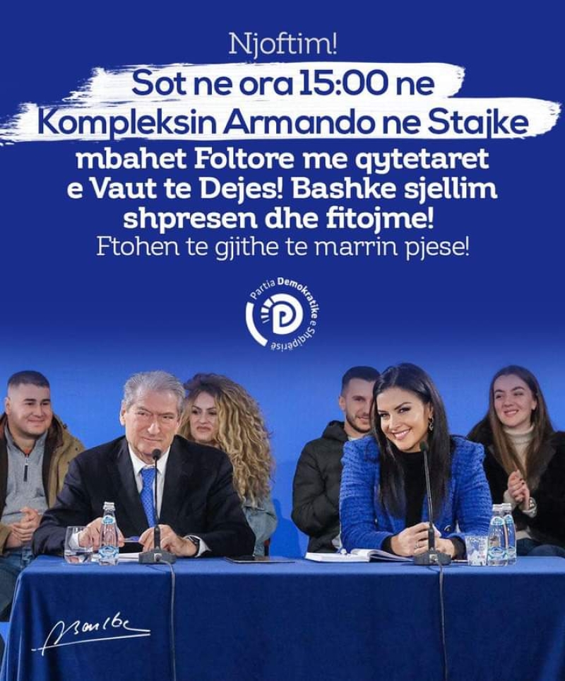 “Sot në orën 15.00 në Kompleksin Armando në Stajkë mbahet Foltore me qytetarët e Vaut të Dejës”, shkruan Berisha në mesazhin e tij ne facebook