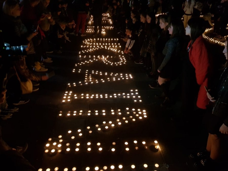 Ata kanë formuar mesazhe domethënëse me qirinjtë e vendosur në shesh, “Paqe për Ukrainën”.
