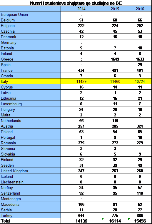 Në krahasim me një vit më parë, sipas të dhënave të publikuara, numri i studenteve shqiptarë në BE ka rënë me gati 1000 studentë, pa përfshirë shtete ku te dhënat mungojnë për të dy vitet. Italia ka numrin më të madh të studentëve shqiptarë, ku në 2016-n sipas të dhënave të Eurostat studionin rreth 10,724 studentë shqiptare në universitetet italiane. Në krahasim me një vit më parë numri i tyre ka rënë me rreth 724 studentë.