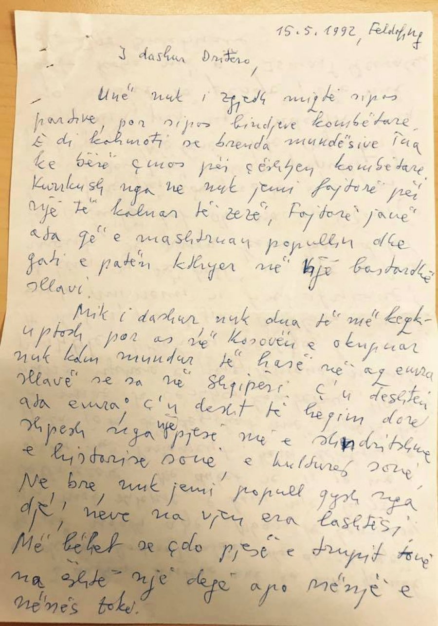Kjo është letra e poetit Ali Podrimja e shkruar më 15 maj të vitit 1992, drejtuar shkrimtarit të madh Dritëro Agollit