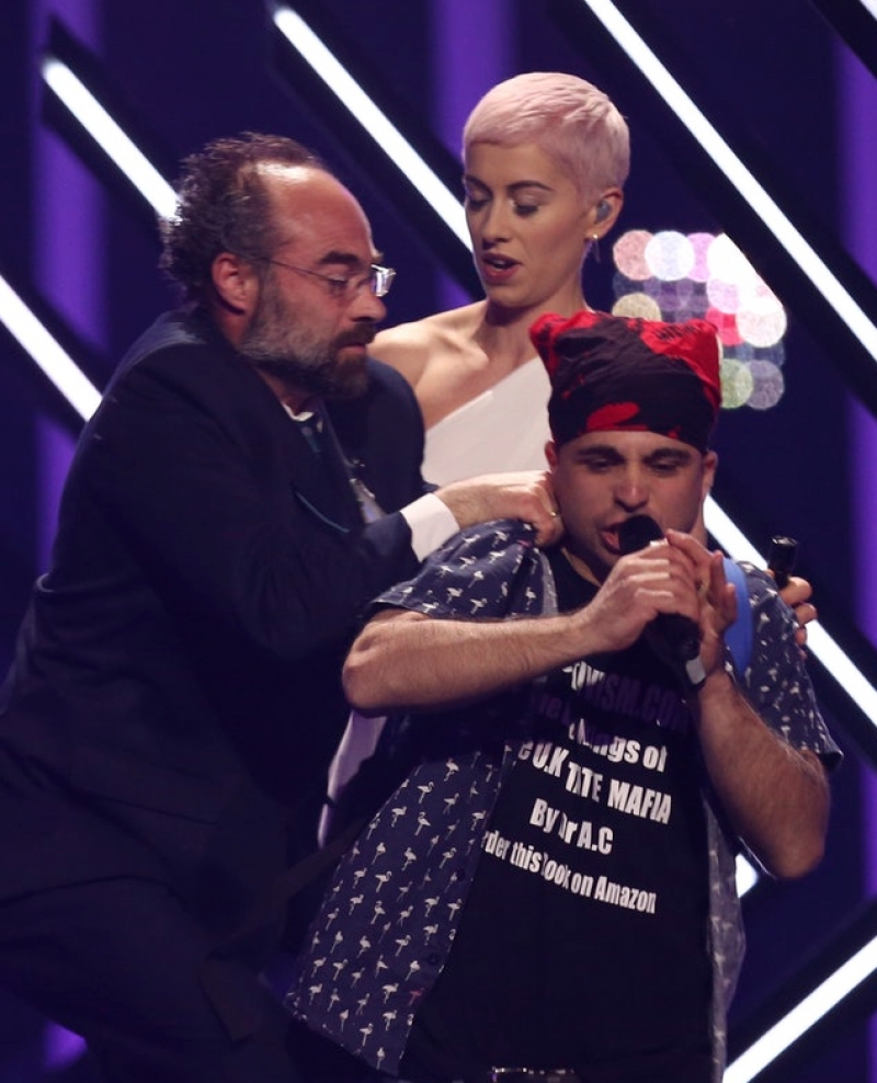 Në ato pak sekonda incident ai u shpreh “Nazistët e medias në Mbretërinë e Bashkuar, kërkojmë liri”, ndërsa menjëherë kanë ndërhyrë forcat e sigurisë, duke ia rikthyer në kohë rekord mikrofonin këngëtares.