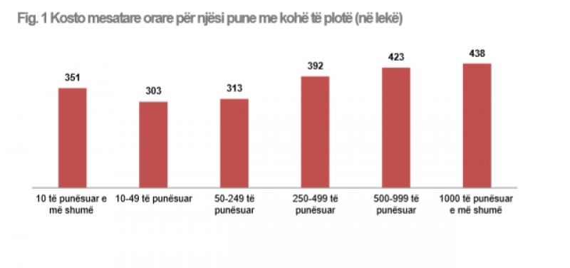Kostoja mesatare orare për njësi pune me kohë të plotë, në ndërmarrjet me 10-49 të punësuar është 303 lekë, dhe për ndërmarrjet me mbi 1 mijë të punësuar është 438 lekë.