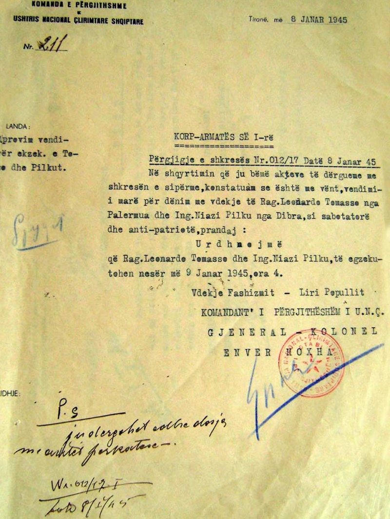 Data 9.1.1945 shënon ekzekutimin e parë me vdekje me vendim gjykate për arsye politike në Shqipërinë komuniste. Ky vendim kriminal u mor kundër një inxhinieri shqiptar dhe një italiani, pa bazë ligjore, por (me vonesë) vetëm të një rregulloreje ushtrie sepse ende komunistët nuk kishin miratuar ligjet e njohur ligjet ndëshkuese. Personat e pushkatuar ishin: