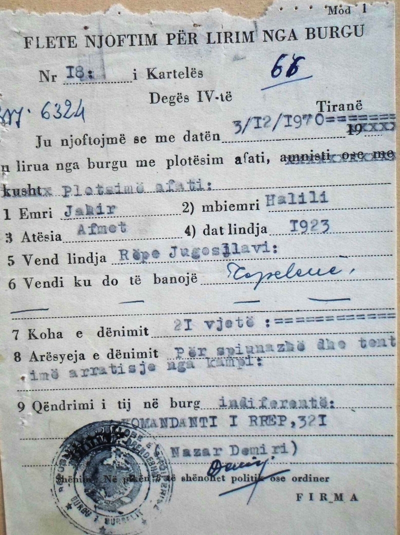 Si përfundim, Jahiri lirohet nga Burgu nr.321 i Burrelit më 3.12.1970, pasi kishte vuajtur plot 19 vjet, 3 muaj, 13 ditë dhe caktohet të banojë në Tepelenë. Muharremi u lirua më 10.12.1972 nga kampin nr.309 Ballsh pasi kish vuajtur 21 vjet, 3 muaj, 12 ditë. Iu caktua për banim Çerma e Lushnjës.