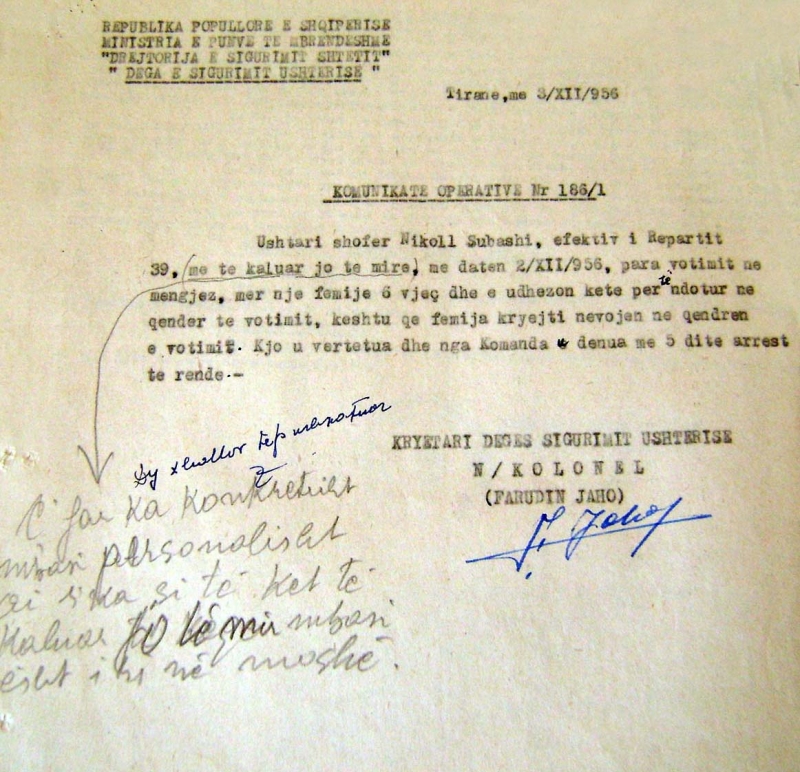 Në qendrat ku zhvilloheshin paradat e votimeve, kanë ndodhur edhe ngjarje të tilla. Në vitin 1956 u zhvilluan zgjedhje vendore që bëheshin për këshilltarë popullorë. Këta pastaj zgjidhnin komitetet ekzekutive apo nivelet e tjera më të ulëta. Kryetarët e komiteteve ekzekutive të rretheve rekomandoheshin më parë nga Byroja Politike dhe pastaj “zgjidheshin” nga këshilltarët popullorë. Pra në këtë rast, bëhej dy herë votim formal: një herë nga populli dhe një herë tjetër nga këshilltarët. Pavarësisht se ishte diktaturë, edhe qendrat e votimit cenoheshin me anë të ndotjes. Rasti bashkëlidhur tregon atë që ka ndodhur.