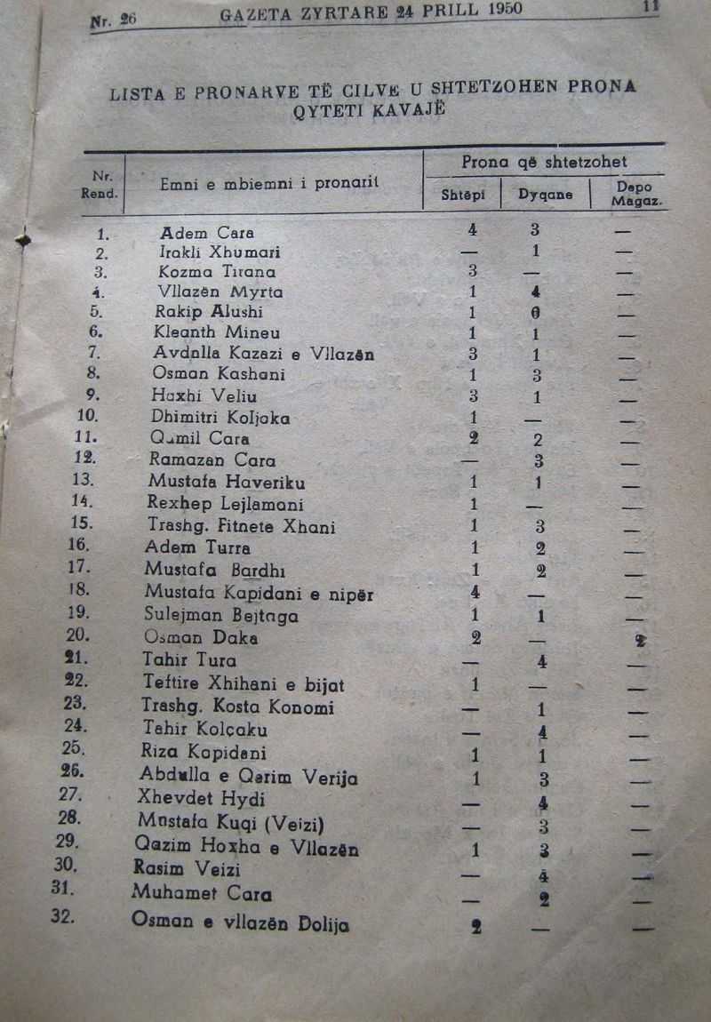 Dekretligji nr.801, datë 22.3.1950 “Mbi shtetëzimin e disa ndërtesave private”, preku një grup të madh pronarësh në Kavajë, iu morën shtëpitë, dyqanet dhe depot (magazinat), një numri të madh pronarësh.