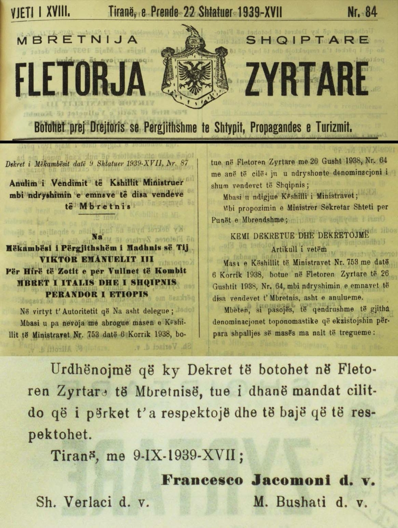 Lista e ndryshimit të toponimeve, e miratuar me vendimin nr.753, datë 6.7.1938, të Këshillit të Ministrave u shfuqizua me dekretin nr.87, datë 9.9.1939 të mëkëmbësit Francesco Jacomoni. Ajo punë e mirë e bërë nga komisioni i posaçëm, nuk qëndroi pak më shumë se një vit. Megjithatë, ajo është një punë studimore e bërë nga specialistët më të mirë të kësaj fushe në atë kohë.