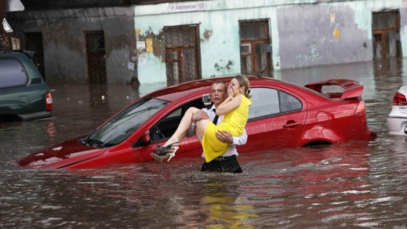 Qyteti u kthye në një liqen pas rreth gjysmë ore shiu. Fotoreporteri i“Reuters” ka kapur heroizmin e një burri, i cili shpëtoi njëra pas tjetrës dy gra të cilat kishin mbetur të bllokuara në makina.