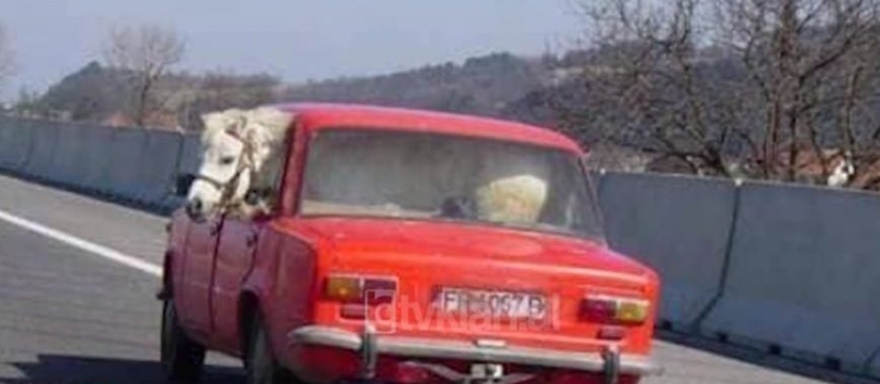 Një kalë është ngarkuar mbi një automjet tip opel, me të cilin po transportohet.