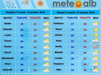 Gjatë gjithë ditës, moti paraqitet me kthjellime e vranësira të lehta. Përjashtuar orët e pasdites të cilat fuqizojnë vranësirat në…