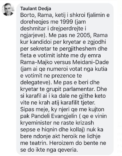 Ish-deputeti i PS-së dhe ish prefekti i Tiranës, Taulant Dedja, i cili jeton prej vitesh në Kanada, në një koment në fb deklaroi se ka qenë dëshmitar i skenës kur kryeministri Majko paraqiti dorëheqjen, tekstin e së cilës e shkroi ish-ministri i Kulturës Edi Rama. Ja postimi i Dedjes: