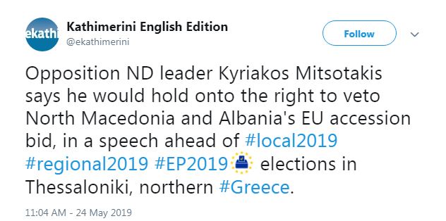 Kërcënimet ndaj Shqipërisë për t’i ndaluar rrugën drejt integrimit europian janë pjesë e fushatës të liderit të opozitës së Greqisë. Kryetari i Demokracisë së Re në shtetin fqinj Kyriakos Mitsotakis ka premtuar para grekëve se do të aplikojë të drejtën e vetos për Shqipërinë, në rast se nuk respektohet minoriteti grek.